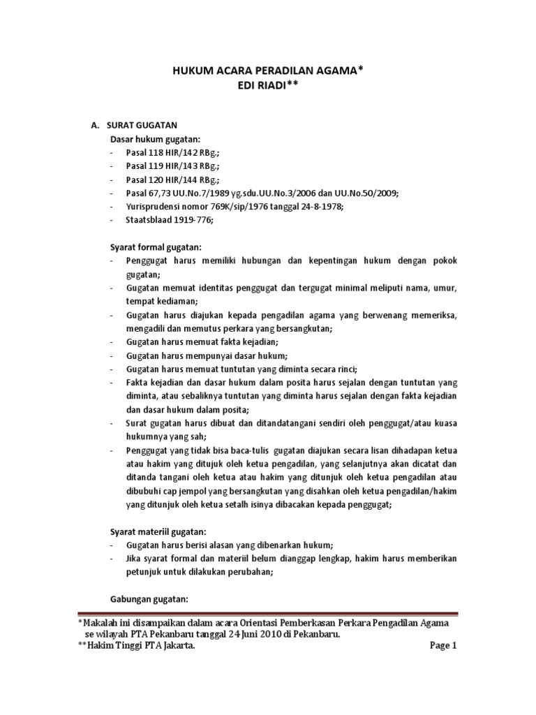 Hukum acara perdata dalam tata hukum indonesia mulai berkembang pada masa penjajahan belanda. 2 pembuatan surat gugatan dan permohonan gugatan harus diajukan secara tertulis oleh penggugat atau kuasanya dan bagi yang buta huruf dapat mengajuakan secara lesan. Andhika rinaldo, umur 55 tahun, pekerjaan karyawan swasta, agama islam, tempat tinggal jalan merica putih. Asas umum lembaga peradilan agama 1) asas bebas merdeka kekuasaan kehakiman a. Sumber hukum acara peradilan agama l 21.